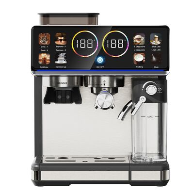 Experience the perfect balance of manual control and automated convenience with this semi-automatic coffee machine featuring 20 Bar pressure for rich, full-flavored espresso extraction. The 1350W power delivers fast heating, while the 2.6L water tank allows multiple cups without frequent refilling. With cold brew capability, you can enjoy refreshing iced coffee alongside traditional espresso, cappuccino, latte, and americano. The touch screen display makes operation intuitive, while the built-in adjustable grinder ensures freshly ground beans.
